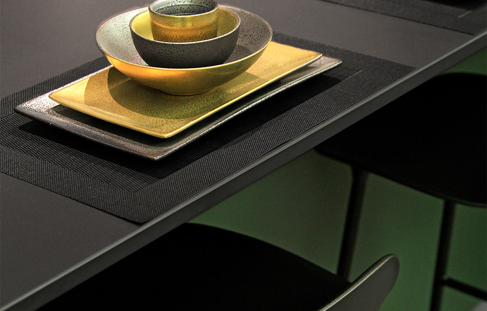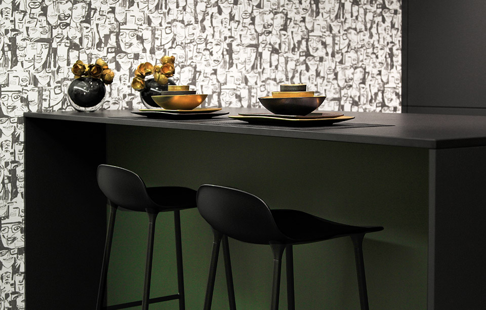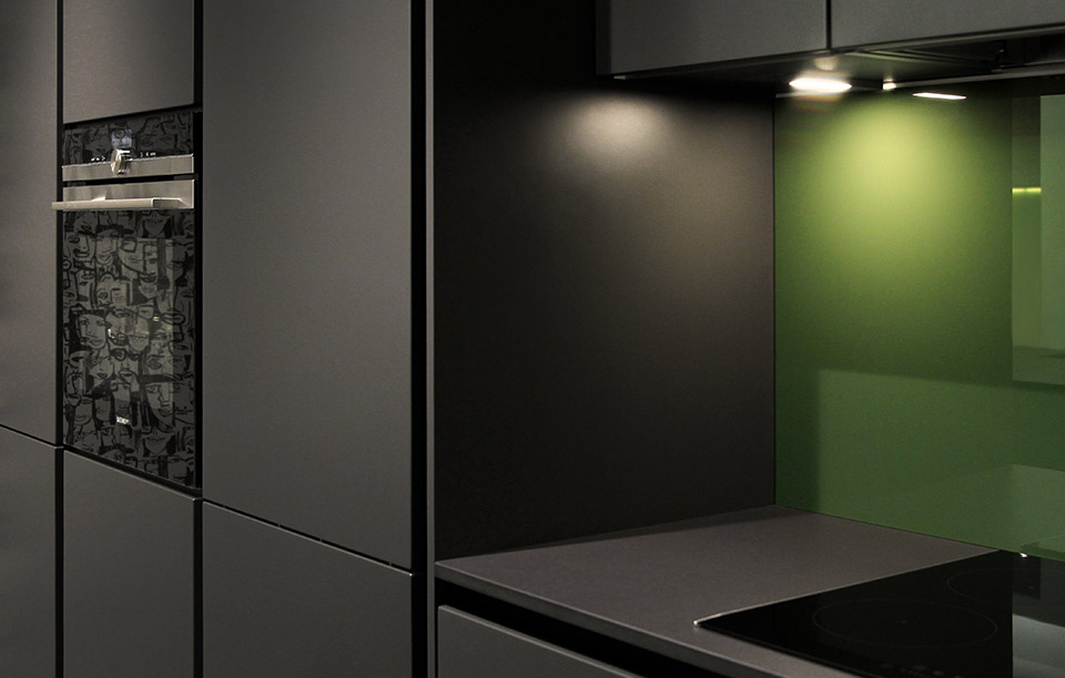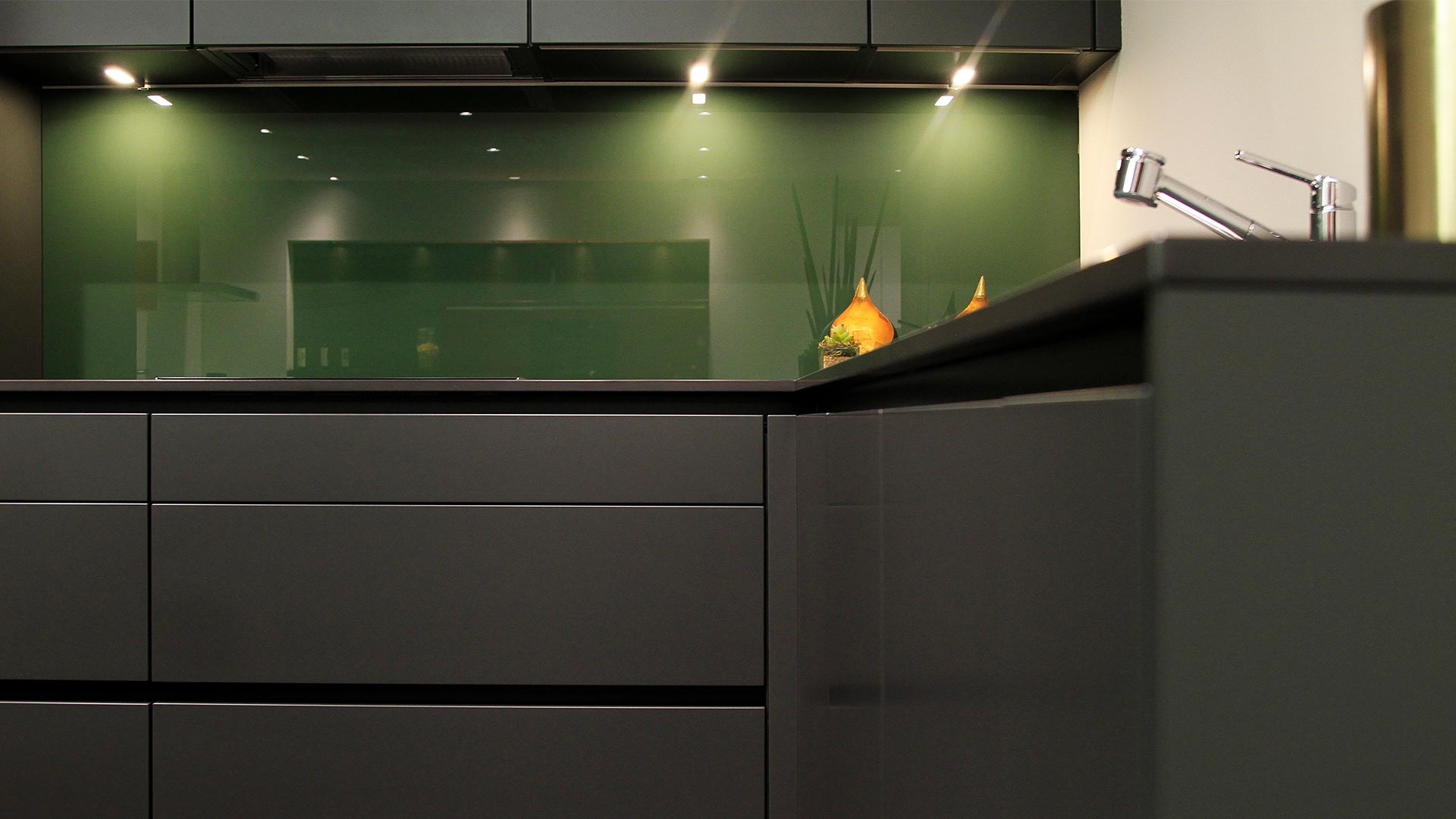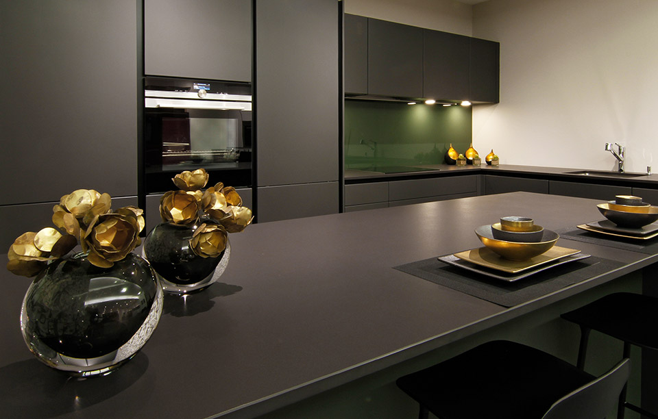 Die Küche selbst ist pure Eleganz. Ton in Ton sind die Farbgebungen von Arbeitsfläche, Fronten und Möblierung gewählt: Dominant ist die Farbe Graphit der Türen und Schubladen, die Korpusse selbst haben schwarz lackierte, voll integrierte Griffleisten und die Abdeckung aus Keramik wurde im matten Schwarz «Domoos» von Dekton gewählt. Die edlen Materialien korrespondieren perfekt miteinander. Das Grün hinter Glas bringt noch mehr Eleganz in diese Küche: Ein komplett sattes Tannengrün vermittelt Ruhe und Souveränität. Da darf es gerne einmal hektisch am Herd zugehen – die Farbe Grün gleicht die Unruhe wieder aus! Die akzentuierte Beleuchtung verstärkt die Wirkung der farbigen Glasrückwand: Grün steht für Natur, Zufriedenheit, Glück und Hoffnung.
