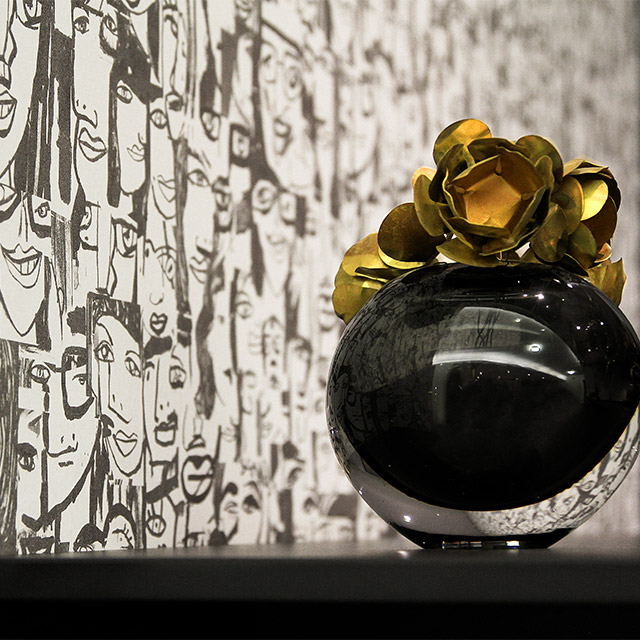 Eine Tapete in der Küche? Ja! Damit geben Sie Ihrem wohnlichen Küchenbereich ein individuelles Gesicht. Die edle Mustertapete lockert die äusserst schlichte und dazu dunkle Küchenmöblierung humorvoll auf. Die Grafik spiegelt sich ausserdem in den Hochglanz-Geräten und vervielfacht so das Lächeln der kunstvollen Wandverkleidung.