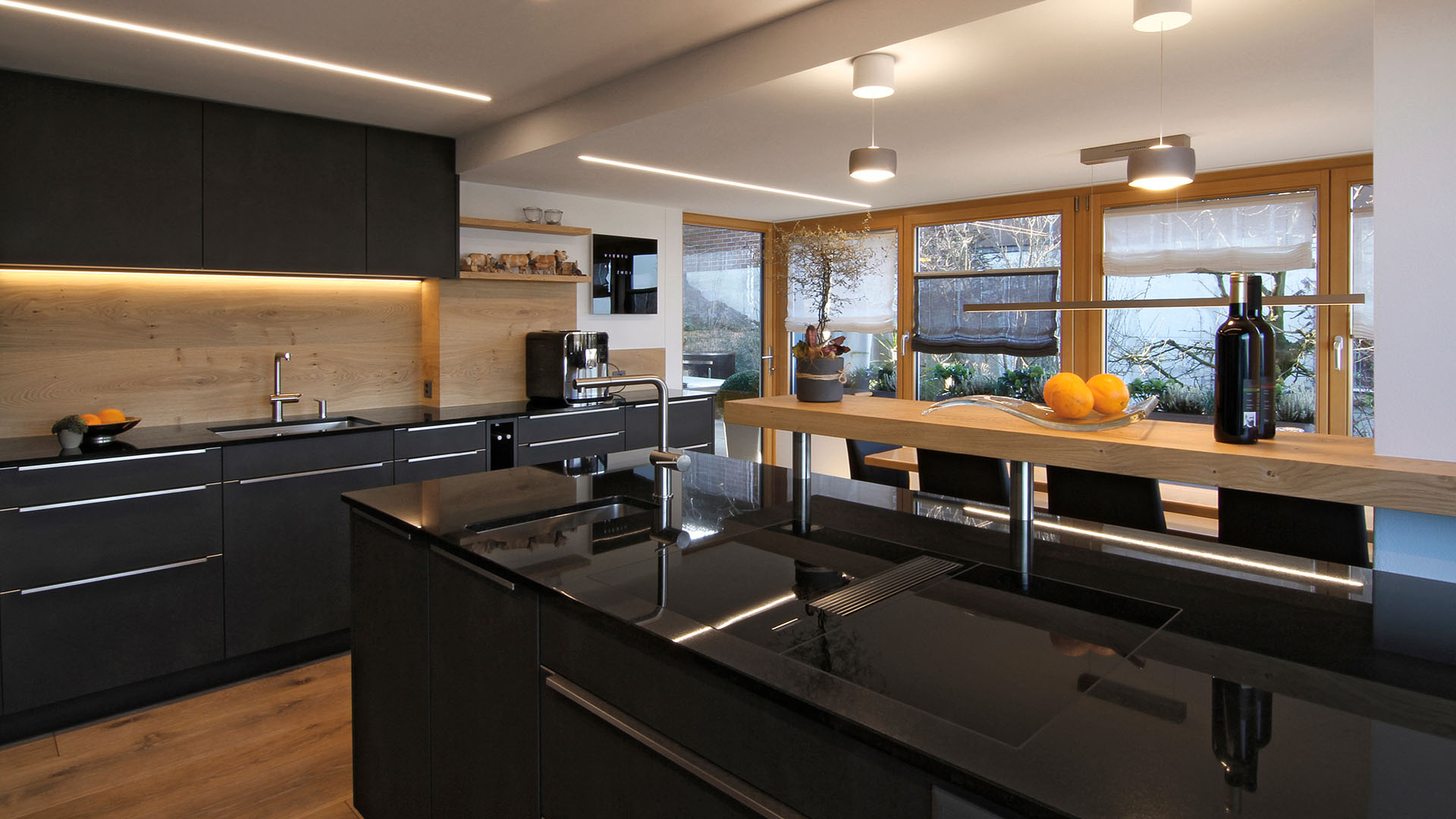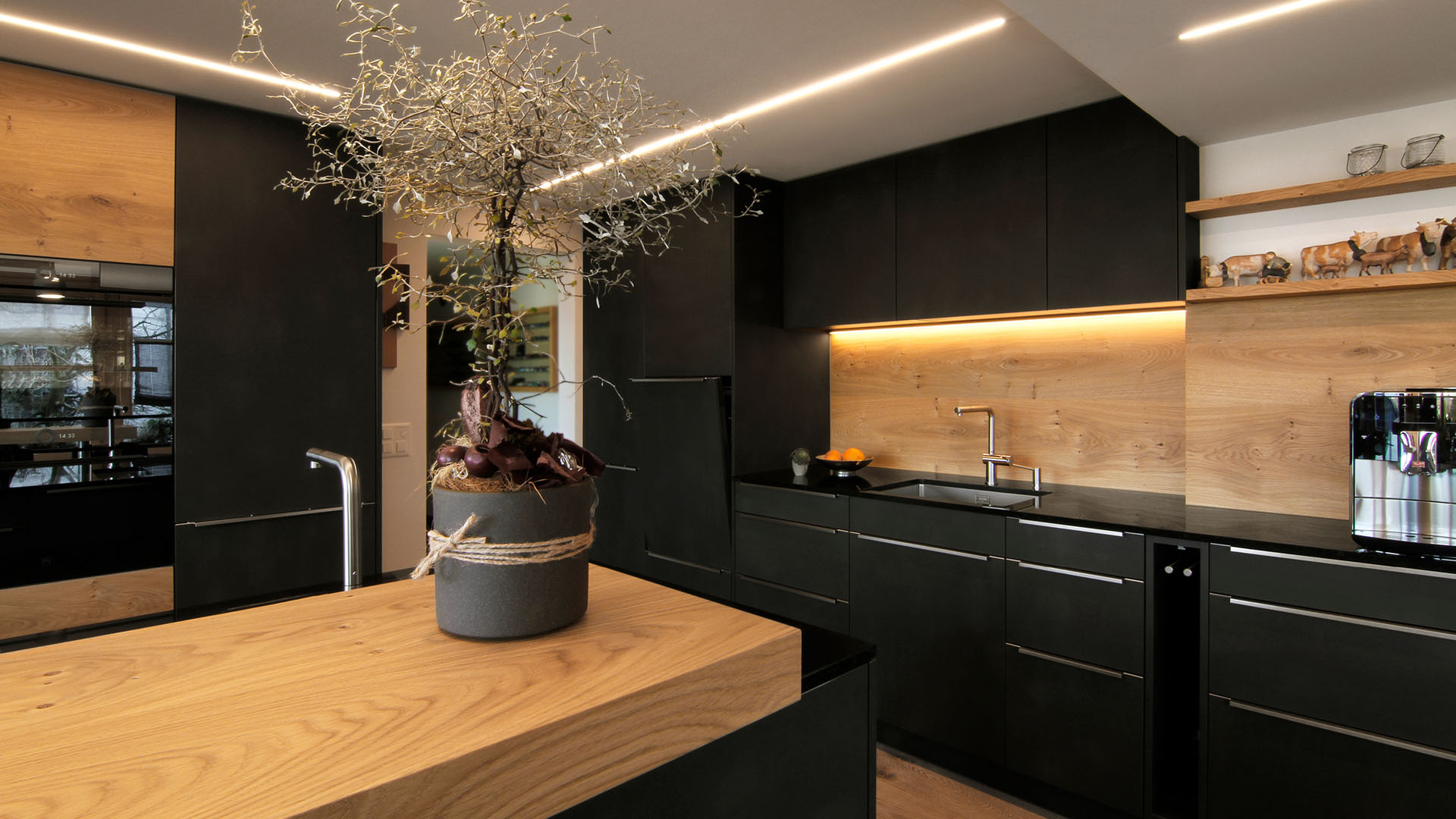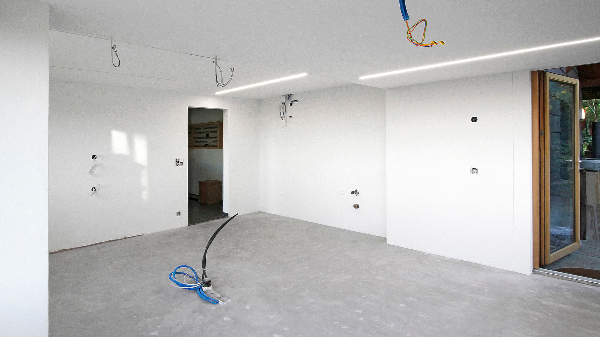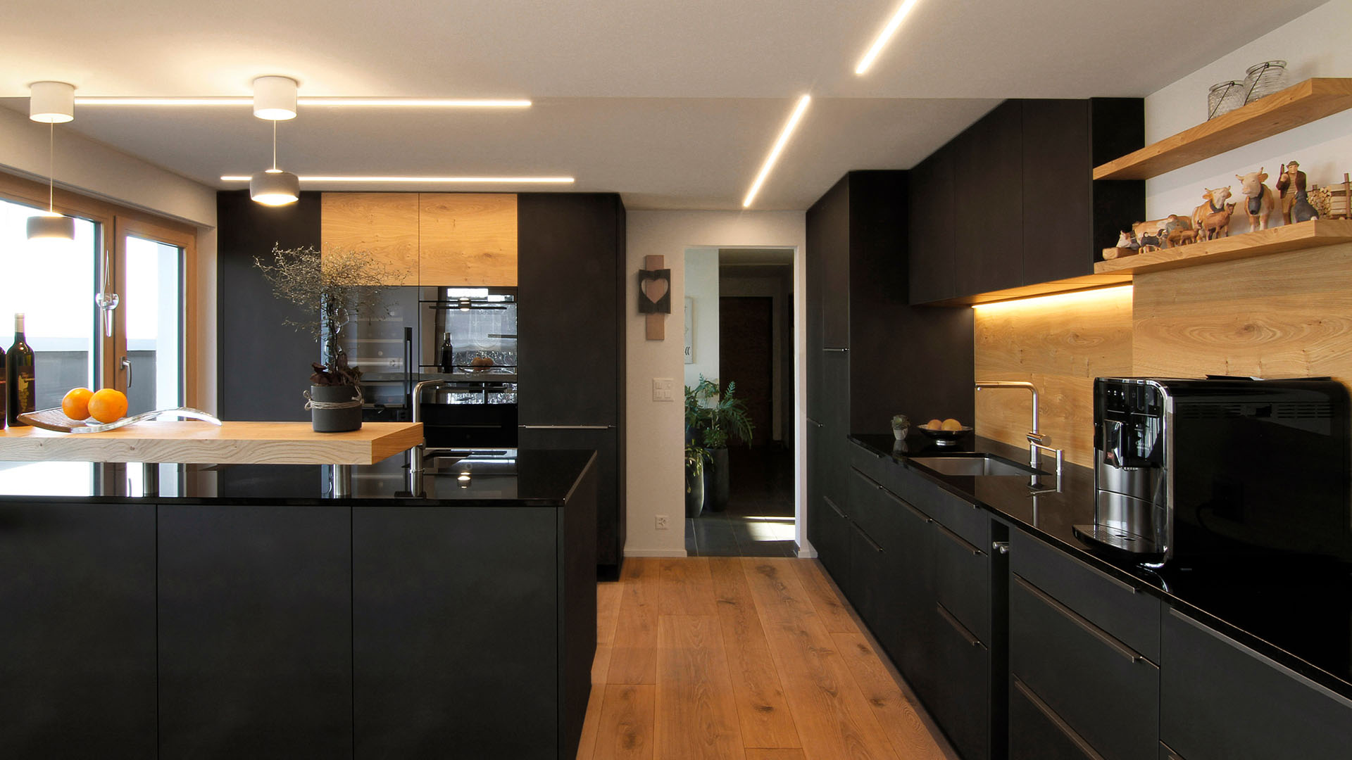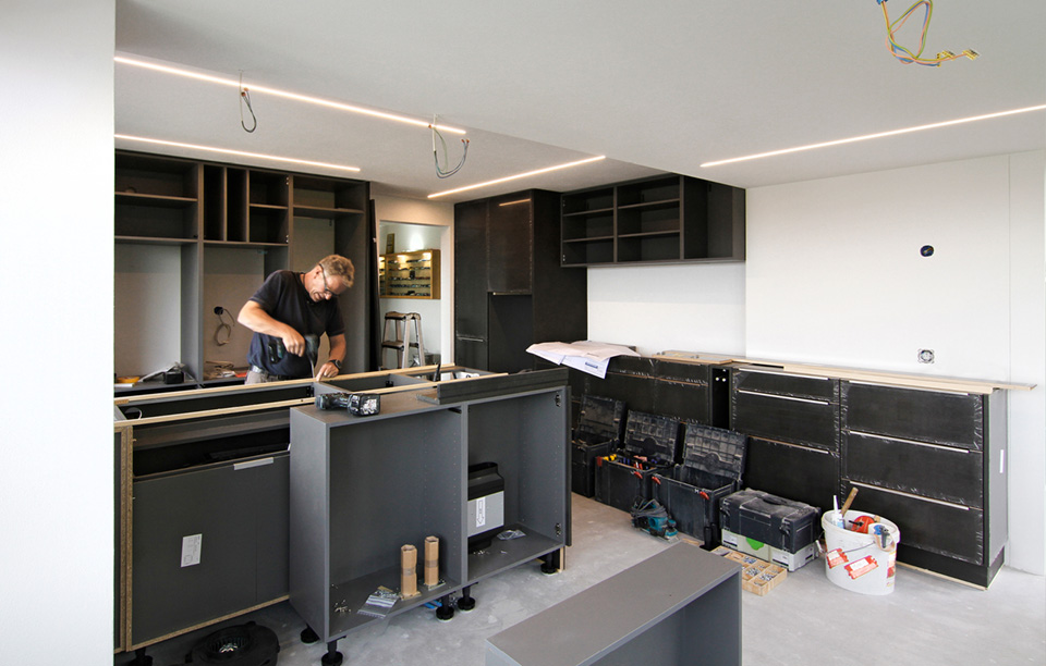 Gemeinsam finden wir mit den Spezialisten selbst unter herausfordernden Bedingungen optimale Lösungen. Die Leitungen für Koch- und Spülinsel beim abgebildeten Renovationsprojekt verlaufen zum Beispiel – da der Boden keine Möglichkeit bot – unter der Kellerdecke. Mit den Kunden entschieden wir zudem, die Küchendecke minimal durch eine fermacell®-Decke herunterzuhängen, damit wir dort auch die Leitungen zu den Leuchten unterbringen konnten.