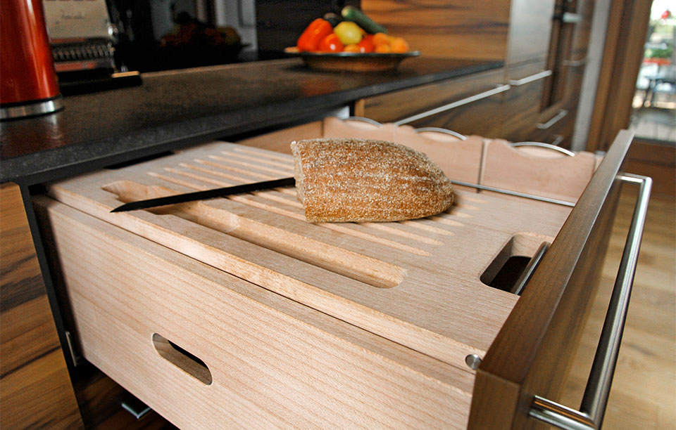 Bei der fertigen Küche schafft das Konzept von Kocherhans dank des Einsatzes von warmem Holz, lebendigem Licht und intelligenten Komfortlösungen ein grosszügig wirkendes, einladendes Ambiente. Vom Amber-geräuchert-Dekor über die dunklen Töne bis hin zum bewusst platzierten Licht «sitzt» die Kücheneinrichtung wie ein massgeschneidertes Kleidungsstück. Diese Küche hat das Zeug zum Lieblingsraum, das verrät die Begeisterung unserer Bauherrin. Funktional zeigen sich alle Teile der neuen Küche; insbesondere aber auch die feinen, praktischen, auf eine elegante Art platzsparenden Details wie das im Kochfeld integrierte Abzugssystem «Eisinger Miracle-Line», die Brotschublade oder die Backblechablage.